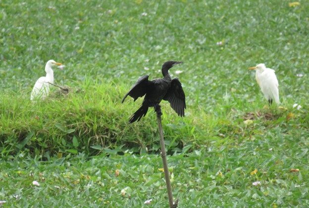 Bức ảnh chụp cảnh thanh bình trên đồng lúa nơi các chú cò trắng thong thả kiếm mồi bên cạnh một chú chim nhạn đen.