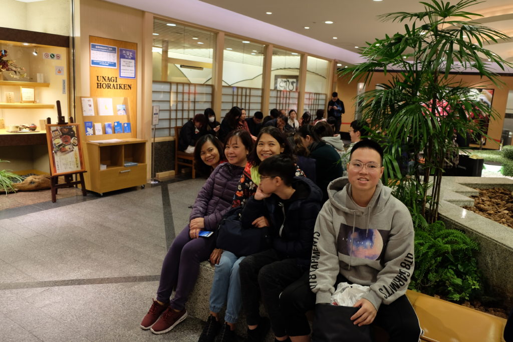 Trước chúng tôi là hàng dài người xếp hàng chờ tới lượt. Họ kiên nhẫn ngồi chờ tới lượt trên những chiếc ghế bên ngoài quán. Hàng người dài cũng chính là một cách marketing hiệu quả của quán. Tuy nhiên, không cần phải lo lắng về thời gian vì hàng người rút ngắn dần nhanh chóng và theo cách rất trực quan sinh động. Các thực khác đang chơi một trò chơi  về dịch chuyển chỗ ngồi.